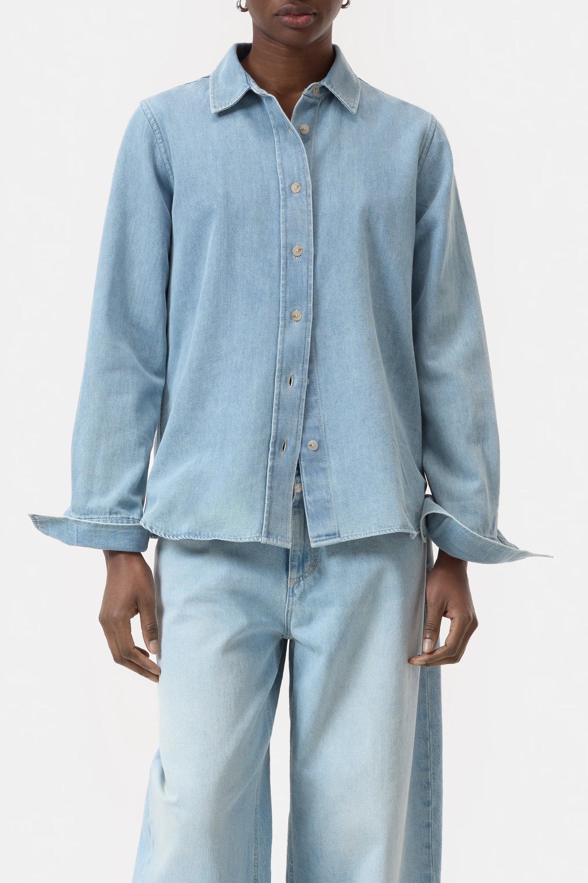 De denim heeft een rechte pasvorm, een versleten wassing, lichte stiksels en een zichtbare knoopsluiting. Wij hebben de bijpassende jeans broek Gillan. De knopen hebben een hoorneffect, afgeronde zomen en lyocellvezels voor een zacht en zomers gevoel. Gemaakt in Portugal.