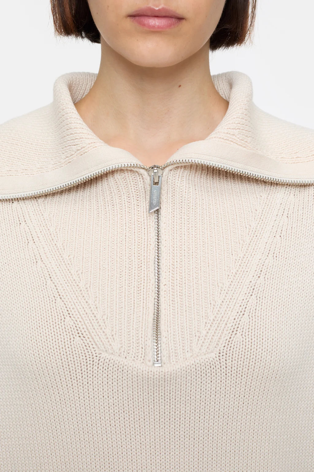 Het is gemaakt van een middelzwaar breisel (5gg) en heeft een opvallende opstaande kraag, verlaagde schouders, een metalen ritssluiting en geribde manchetten aan de mouwen. Een speciaal kledingstukverfproces geeft de trui een licht vervaagde look.